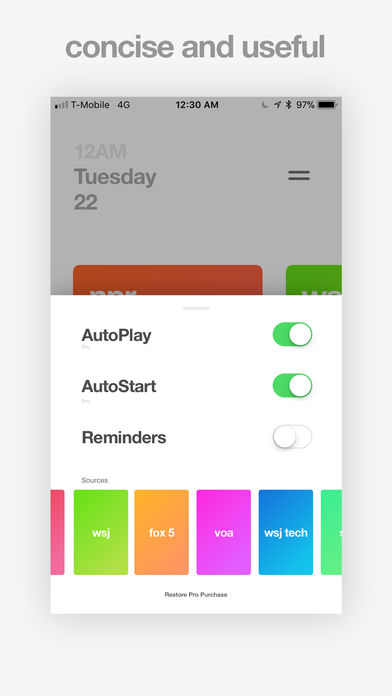 Hourly audio news summaries from outlets like NPR, WSJ, CBC, VOA, Fox 5 and more. Funnel gives you a clear account of what's going on in the world from a multitude of sources. Just pick your favorite and listen from anywhere. Control the sources in your feed and set up AutoPlay, Autostart and Reminders for a custom experience.