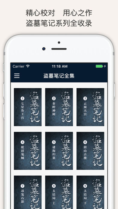 盗墓笔记系列全集【精校版】 精心校对,用心之作! 这是一款专门为全世界“稻米”精心打造的【盗墓笔记】系列全集应用,包含了盗墓笔记系列全部作品。每一部作品都经过精心编排,排版好,相信一定不会让你失望。 还在犹豫什么?赶紧下载应用,让南派三叔带你走进土夫子的世界吧~