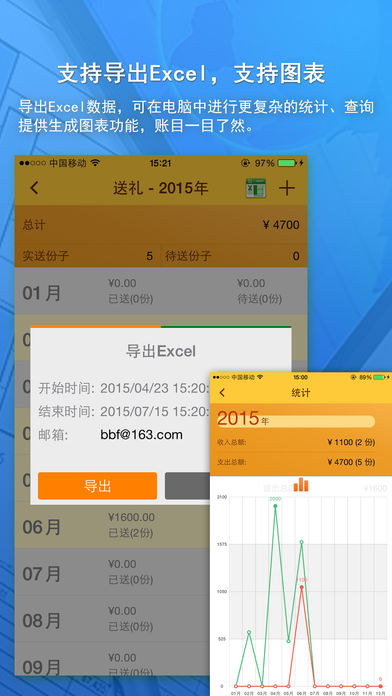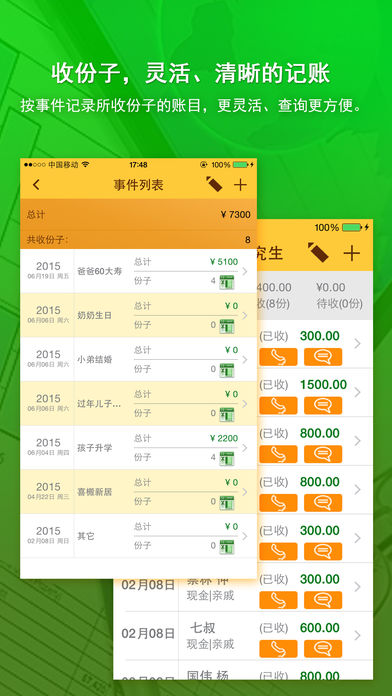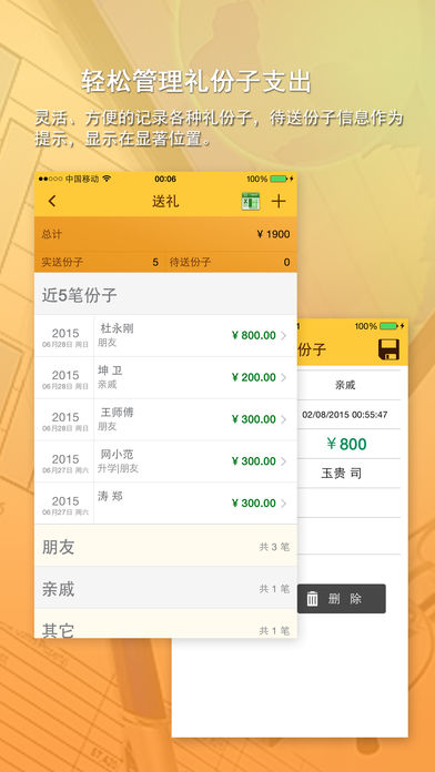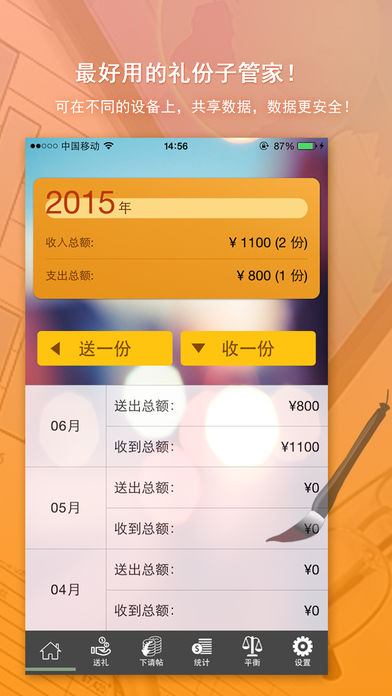 份子钱,猛于虎!您是如何纪录和管理您的礼账呢?记到纸上,或保存到电脑的文件中,这样的记录即不方便、又不安全。《礼份子》帮助您把您送出去和收到的礼份子,都记录下来,轻松管理各种人情往来。最好用、最强大的礼份子管家是您正确的选择。 礼份子提供功能如下: -从您的联系人列表导入联系人,减少复杂的输入操作; -提供预送礼功能,并在首页显著位置显示,做到提示功能; -收份子,按事件管理,便于查询、统计; -提供导出Excel功能,将Excel导入到您的电脑中,更容易编辑、统计及查询; -提供平衡比较功能,左右对比,让您时刻了解,礼份子是否平衡; -提供云备份功能,可在不同的设备中共享数据。 礼份子带给您的不止是简单的记录,它更倾向于管理,希望您喜欢!