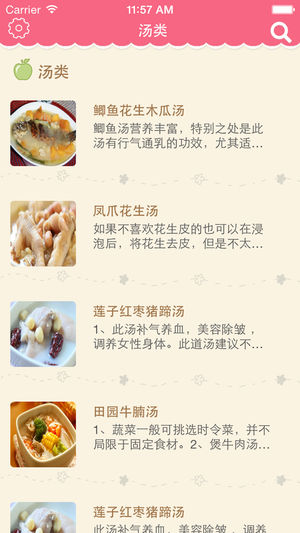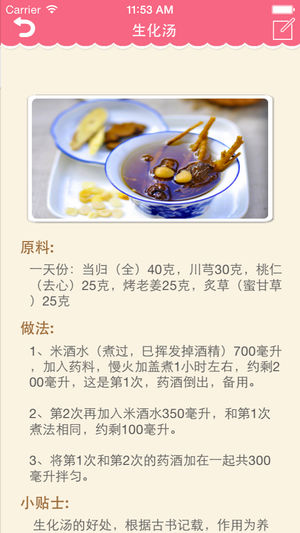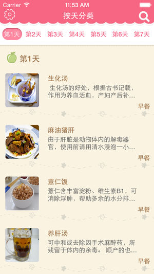 ^_^ ^_^ 生机饱满的营养,多彩鲜艳的胃口,绿意盎然的心情,我们给予您产后最全面的关怀。 应用程序简介: 1.为妈妈精心准备海量产后恢复食谱,包含28天每日早,午,晚推荐以及炒菜,汤类,粥类等百道经典产后食谱。 2.支持全文检索、关键字查询。 3.购物单菜谱收藏功能,方便您及时调出购物信息。 4.优美合理的布局界面,效率护眼。 5.信息本地储存无需连接网络。 注: App所有食谱做法仅供用户您参考,一切以医生建议为准。 我们将不断更新数据,升级版本。谢谢您的支持和鼓励...