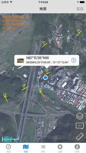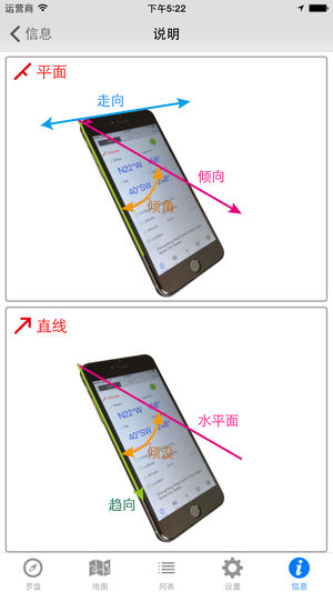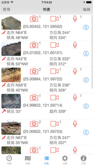 本程式主要用于量测地质构造之位态,具有以下特点: 1) 可记录现地之地层走向、倾角、倾向、方位角、座标、高程及地点。 2) 亦可量测线构造。 3) 可选择以真北或磁北作为方向基准。 4) 调查成果同时以地图及列表方式展示。 5) 调查数据可汇出为csv档,以作为后处理使用。 6) 此外,使用者亦可针对量测数据添加照片、影片、语音备忘或文字描述,以增加量测数据之辨识性。所有照片、影片及语音备忘档案均可透过iTunes下载至个人电脑。
