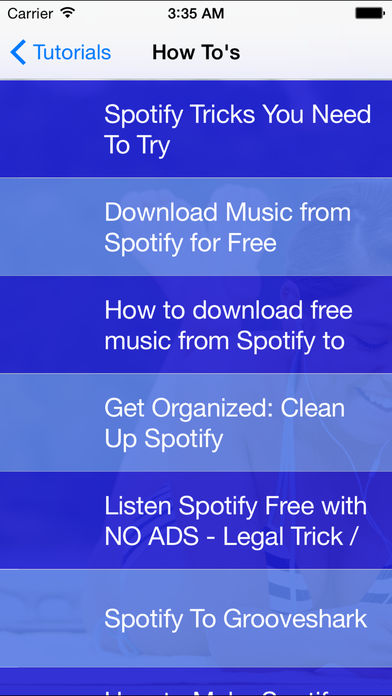 Spotify es un servicio de streaming de música comercial que proporciona una gestión con restricción de derechos digitales [4] El contenido de los sellos discográficos includingSony, EMI, Warner Music Group y Universal. La música puede ser navegado o buscar por artista, álbum, género, lista de reproducción o sello discográfico. A cargo suscripciones Premium Elimina la publicidad y permiten a los usuarios descargar música para escuchar sin conexión. CARACTERÍSTICAS: • ¿Cómo es • Trucos y consejos • Pautas básicas • Y muchos más Descubrir la aplicación con sus amigos y familia! Descarga esta guía para Spotify ilimitado fragmentado Escuchar Radio Station aplicación!