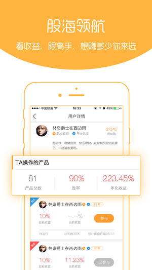 这是一款社交类的炒股软件,这里有许多严格评比出来的高手:实力高手、明星操盘手、个股专家,他们分别专注于不同的产品形式,新版本中三大产品全面升级,让你以喜欢的方式跟着高手玩“赚”股市! 【跟随高手产品】 跟随高手自营盘是一款用目标收益来评价的产品,用户选择收益目标,高手达成目标后,产品才算完成,无时间限制,相对长期稳定。 【操盘手产品】 操盘手会在指定周期内,完成预定的目标收益。短时间内利润率更高,收益更快。 【个股锦囊产品】 高手们以锦囊的方式,推荐关注活跃股票,附有看涨依据,预期涨幅,简单清晰! 我们,还有更多: 优化高手评价体系,会赚钱才是真高手。 界面升级,细致新手引导。 全新高手排行…