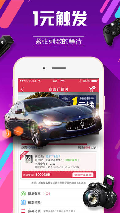 不要怀疑,只需1元零钱就有机会买到上万块的数码产品,全民夺宝给你一切皆有可能!现在下载全民夺宝,立即体验全新的一元购物! **************万人亲测,强烈推荐!******************** 在全民夺宝,体验全新的一元云购方式,实现自己一元收获全球最潮最热商品的梦想。 【完成梦想,只需一元】 上百种潮流热门的奖品,100%正品保证,全国包邮! 只要一元夺宝,就能实现自己拥有火爆商品的梦想! 【公平公正透明的规则】 公平:所有参与用户,都享受同样的权利与义务。 公正:实时在线数据,保证众筹分配结果的随机性,保证绝对公正性。 透明:计算公式和相关数据完全公开透明。 【紧张刺激的等待过程】 参与全民夺宝,体验前所未有的紧张刺激,更有机会享受到获奖的超级乐趣! 【和朋友分享喜悦】 查看其他小伙伴在全民夺宝收获的喜悦,目睹60000+用户晒单分享! 全民夺宝-掌上秒杀神器,一元零钱欢乐购,1元云购热门特惠特卖正品,红包返利送不停,海淘折扣逛街的省钱助手 (特别声明:本应用所有活动与内容跟苹果公司无关)