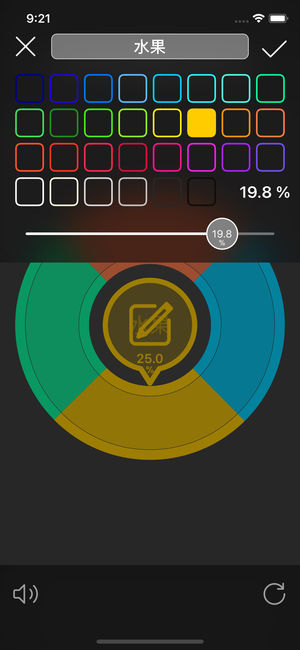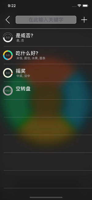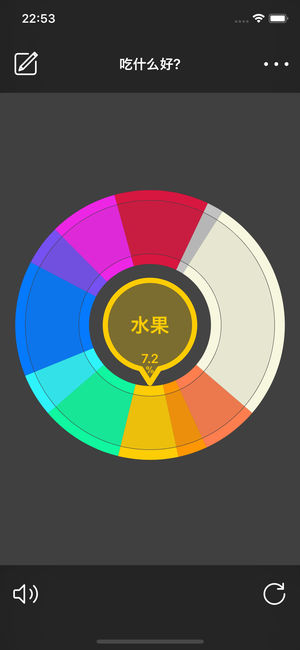 1 它能在你犹豫不决时快速地帮你做出选择; 2 它能随意编辑项目的名称、颜色及概率(精确到0.1%); 3 它能模拟摇奖盘; 4 它能模拟陀螺旋转; 5 能保存500个不同样式的转盘; 6 滑动转盘或按住圆心可以使转盘加速旋转; 7 没有广告和内购项目