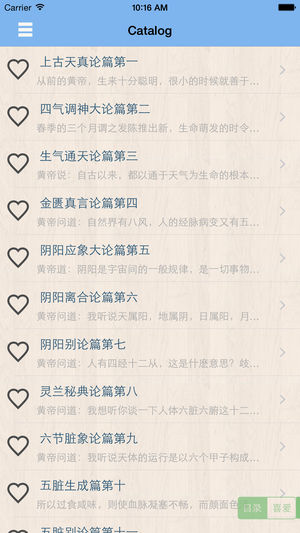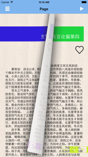 《黄帝内经》是我国最早的典籍之一,我国劳动人民长期与疾病做斗争的经验总结。 功能说明: 书籍目录 设置连续朗读所有章节的内容 调整字体大小 睡眠定时,在设置的时间点停止朗读内容,便于休息 夜间/日间模式切换 历史浏览记录 手势翻页效果 收藏喜爱篇章 繁简切换