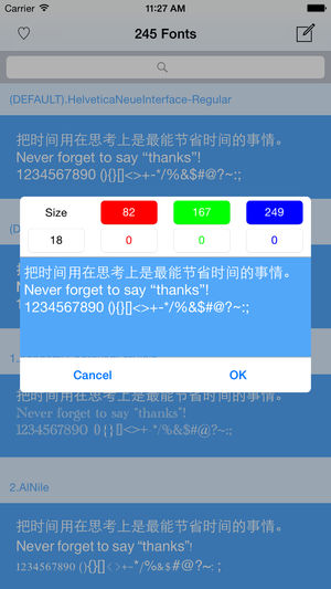 《系统字体》用于帮助UI设计师为App设计选择合适的字体,是设计师必备字体手册。 提供了系统内置所有字体的浏览,您可以自定义预览文字内容、字体颜色、字体大小、背景色,收藏喜欢的字体和查看最受欢迎的字体。 支持iOS9、iOS8、iOS7. 注意,此软件不是用来修改系统默认字体的,因为iOS根本无法修改系统字体。 欢迎关注微信公众号:李帅说(lishuaisaid)