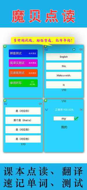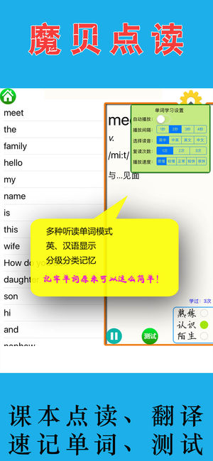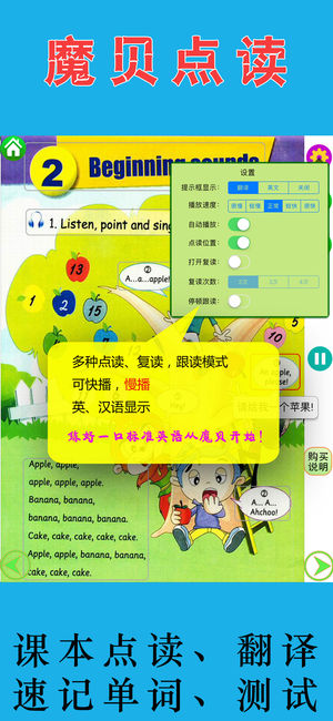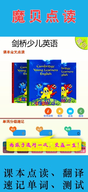 《魔贝点读学习机 - 剑桥少儿英语 》是全网内容最全的《剑桥少儿英语 》点读学习机。 这一次,你为孩子做了正确的选择——魔贝点读学习机。 选英语点读软件,从以下几个方面判断:录音质量、点读长度设置、播放功能科学性、译文的准确性、单词速记的有效性。 《魔贝点读学习机 - 剑桥少儿英语 》 ■清晰的原声外籍人士录音。(没有咝咝的背景电流噪音) ■史上最细、最贴心的教材点读长度设置。尽可能分词、分句、分人物对话作为点读单位,方便跟读。 ■播放功能科学,可以随意播放课文中的单词、句子等。可设置多种播放复读模式。可以慢播、快播。 ■英语翻译均由英语八级证书获得者完成,准确到位。 ■每课有专门的单词…