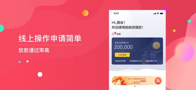 凭身份证,2小时下现金8000元! 【产品特色】 1、闪电借款:极速小额借款,线上全自动化信审,快至2小时到账。 2、额度灵活:小额轻松借,大额高至5万! 3、门槛超低:无抵押无担保,有身份证就能借。 4、操作便捷:借款进度实时查询,到期分期还款提醒,借还方便。 5、自主提额:额度跟随信用状况变更,实时提额,快至30分钟出结果。 【关于拍拍贷】 拍拍贷成立于2007年6月,并于2017年11月在纽交所成功上市。拍拍贷是一家P2P网络信用借贷平台,也是一家由工商部门特批"金融信息服务"资质,得到政府认可的互联网金融平台,并多次受到CCTV、人民网等权威媒体报道。 【联系我们】 客服电话:4…