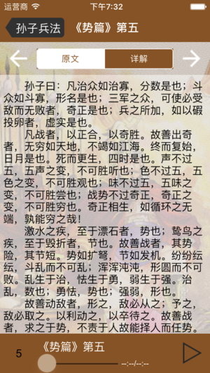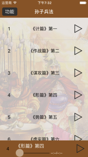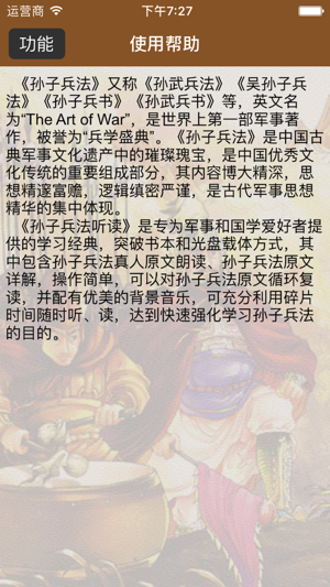 《孙子兵法》又称《孙武兵法》《吴孙子兵法》《孙子兵书》《孙武兵书》等,英文名为“The Art of War”,是世界上第一部军事著作,被誉为“兵学盛典”。《孙子兵法》是中国古典军事文化遗产中的璀璨瑰宝,是中国优秀文化传统的重要组成部分,其内容博大精深,思想精邃富赡,逻辑缜密严谨,是古代军事思想精华的集中体现。 《孙子兵法听读》是专为军事和国学爱好者提供的学习经典,突破书本和光盘载体方式,其中包含孙子兵法真人原文朗读、孙子兵法原文详解,操作简单,可以对孙子兵法原文循环复读,并配有优美的背景音乐,可充分利用碎片时间随时听、读,达到快速强化学习孙子兵法的目的。