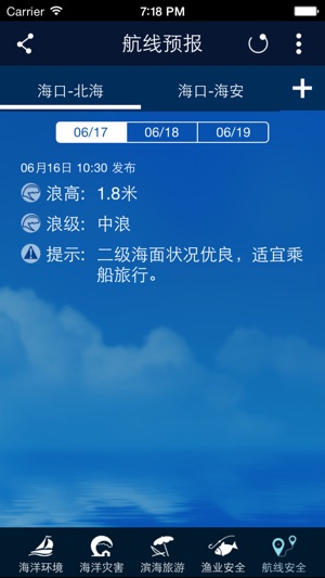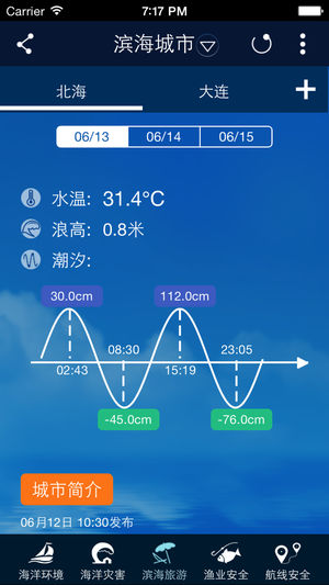 海洋预报台是由国家海洋环境预报中心发布的一款对于我国海洋环境预报、海洋灾害预报和警报的海洋气象预报软件。 主要功能: 1. 海浪预报 2. 风暴潮预报 3. 海冰预报 4. 海流、海温预报 5. 海洋气象预报、海啸预报