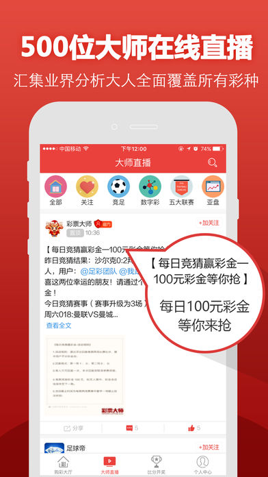 彩票大师 彩票预测足彩预测购彩神器 【新人活动】新人立得15元红包,手机购彩、专家足彩预测随心用 【免费竞猜】免费参加猜赛果活动,百元大奖日日累加等你赢 【快捷支付】微信、支付宝、银联三大渠道畅通无阻,提现省心 【特色功能】竞彩足球、传统足彩14场、双色球、大乐透、11选5、福彩3D,体彩福彩全彩种覆盖,千位足彩分析师、数字彩分析师在线直播为您提供手机购彩咨询 史上最全彩种 【足球彩种】竞彩足球、传统足球14场、任九(足彩任选九场)、足球单关、北京单场——7种玩法全覆盖,更有独家足彩预测 【篮球彩种】竞彩篮球、北京单场篮球——5大玩法随心选 【数字彩种】双色球、11选5(高频彩)、大乐透、福彩3D、排列三、排列五、七星彩、七乐彩,彩票预测随心看 【彩种齐全】足彩、竞彩、高频彩、数字彩、福利彩票、体育彩票,购彩、预测、分析全都有! 独家彩票预测 【竞彩方案】彩票大师拥有千位分析师,每日发布竞彩足球投注方案、精准预测数据 【足彩密料】足彩预测师分享大量独家情报,帮你掌握别人不知道的密料 【正规有效】彩票店实体出票,真实兑奖开奖,投注无忧 【新人大礼】每位彩票大师新用户立得15元红包 【免费赢大奖】每日100元彩金大礼日日累加,免费参加竞猜活动,猜对独赢大奖 【强大团队】彩票大师拥有来自澳客、懂球帝、竞彩网、足彩通、球探足球比分、全彩时代、新英体育、nike内马尔vr、zhibo8、金山彩票、91彩客彩票、qq彩票、彩民村、91彩站联盟、91彩票联盟、彩票365、全彩助手、中彩网的众多彩票精英、足彩预测名家、彩票预测专家,为您带来集合众家所长的全新功能体验!