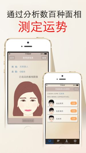 仅仅依靠以你出生年月日为基础的四柱八字来掌握你的命运是相当困难的!! 面相是一个人与生俱来的,看相不仅能看出这个人一生的命运,还能指示你未来生活的走向。 泄露天机看相软件是用在观相学方面潜心研究50年的易学专家们在现代社会中实际验证过的数据作为基础,同时融入现代风格而开发、设计的实用性应用软件。你不仅能利用它测出自己的运势,还能利用它掌握你身边异性或未来伴侣的运势! 你能通过数百种的面相组合测出不同面相的人的命运。 本款应用软件下载之后所有功能都能免费使用,你可以通过自己和心仪异性的面相来洞察两人爱情的未来。 你能利用本软件测出在你人生中很重要的那些运势(能掌握你人生兴亡盛衰变化的图表,财运,…