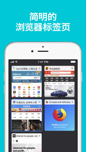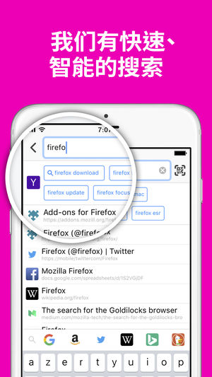 体验快速、智能、个性化的网络。 Firefox 是由独立、以人为本的 Mozilla 制作的浏览器,曾获选隐私方面最值得信赖的互联网公司。 今天就升级,加入数以亿计的 Firefox 用户群,获得更加个性化的浏览体验。 快速、智能、个性。 Firefox 为你而生,让网络体验的掌控权重回你手中。 这也是为什么我们要在产品内放入满满的智慧功能,让您上网时不再犹豫不决。 智能搜索,更快获取 - Firefox 能预测您的需求,每次都直观的在你喜欢的搜索引擎上提供多项建议及以前搜索过的结果。 - 轻松访问各类搜索服务,包括维基百科、Twitter、亚马逊等。 隐私浏览 - 您的个人信息只属于您…