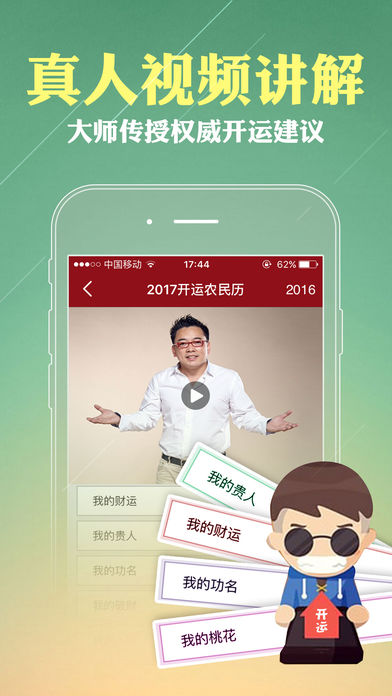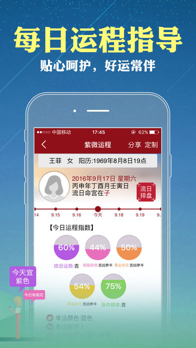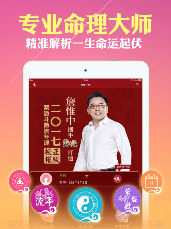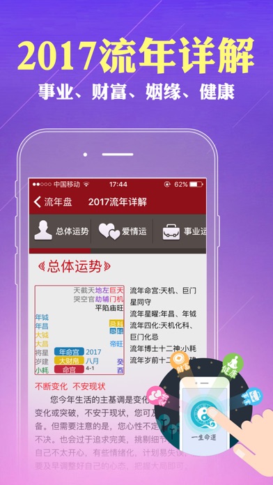 最新最全面的流年运势预测分析! 台湾命理领军人物詹惟中老师紫微斗数经验总结,给你最专业准确的命理分析! 紫微斗数,中国传统命理学最重要支派之一,以人的生辰八字确定十二宫位置,构成命盘,结合周易干支理论,来预测一个人的命运、吉凶祸福。 紫微斗数以星宿配合十二宫的术数算命方法,是一种星相术,亦是中国传统相术中的一个分支;因其系统里以紫微星为诸星之首,故得名。 【开运达人】 詹惟中老师,现任台湾专业命理风水阳宅老师,命理界领军人物。老师精研紫微斗数二十余年,并应用深奥的紫微十八飞星四化论,将难懂的天干顺序为易解的灵动数,用数字来改变经营一生!另外,也精通五行、风水、面相、奇门遁甲等中国命理精粹。 詹惟中老师怀抱着悲悯之心,希望每个人都能掌握自身命运,以老祖先的智慧,洞察未知的时运,透过预知与预防,将可能的伤害降到最低。现在与大中华区最专业的命理团队灵机命理馆合作,打造专业的紫微斗数应用,希望藉此能帮助更多的人掌控自身命运,助生活、健康、财富更加平顺稳定。之前错过洞烛先机的读者,更是不容再错过! 【应用特色】 1.流年运势分析—精准预测财运起伏、感情婚姻、事业工作等运势情况,预知发展机遇。 2.婚姻感情分析—了解您的婚姻生活状况,找出适合於您的婚姻对象,了解伴侣出轨的几率。 3.财运状况分析—预测您财运好坏、富有程度,金钱的支配使用情况,以及赚钱的能力与机会。 4.健康注意分析—了解自身的健康状况,身体的弱点,提早做好疾病预防工作。 5.事业发展分析—看出您是否适合创业,与上司相处的互动情况等资讯,提供专业的职业定位建议。 6.每日运程指导—结合自身命理情况,提供每日运势点评,还有开运方法补充每日正能量。 【联系我们】 灵机官方网站:http://www.linghit.com 灵机手机网站:http://m.linghit.com 灵机微信账号:lingjimiaosuan