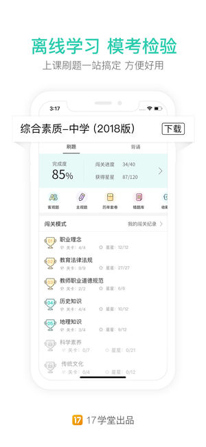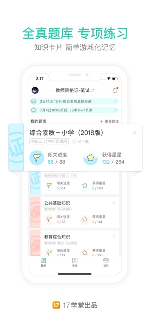 教师资格证,教师招聘考试的同学有福啦! 游戏化闯关,攻克每一个知识点,快乐学习! 还有免费直播课程,真题解析,名师讲解! 全面覆盖教师资格证考试各个科目(语数外音体美幼),直接闯关攻克每一个知识点,笔试面试二合一,全面备考,教师资格证考试从此不再难! 18年,就用一起考教师! “口碑爆棚”的教师资格证、教师招聘考试备考应用! 5000000+考生正在使用、150000+考生同时在线刷题听课! 由17学堂出品 【18年,一起通关】 教师资格证考试:笔试涵盖幼儿、小学、初中、高中综合素质+保教/教育/教育教学知识与能力+专业课,面试涵盖结构化+试讲+答辩。 教师招聘考试:笔试涵盖多省市教育综合…