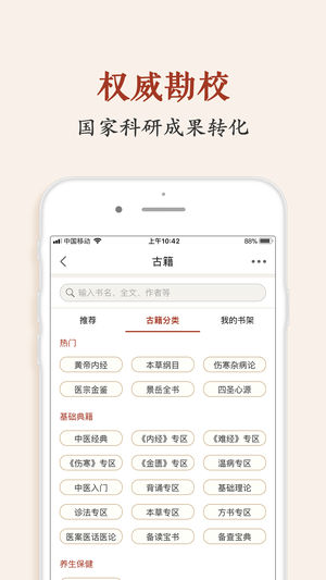 ▶ 中医古籍——中医人的掌上古籍图书馆 中医智库旗下一款集成中国历代医学典籍的 中医类App。收录历代医家海量著作,包含 中医入门、养生保健、本草方书、临证各科等 详细分类,是中医医生、中医爱好者学习 和研究必备工具! ▶ 涵盖书籍 【中医经典600种】涵盖内经、伤寒、本草等 【养生食疗保健60种】涵盖延寿、食疗等 【经络穴位推拿50种】涵盖经络汇编等 整体来看,经典著作原本及解读、养生保健书、 针灸中医经典、临证各科、珍藏孤本、 争鸣流派等各类专题古籍总计多达2千余种。 支持书名、作者、全文搜索, 糖尿病、体质养生、张仲景、附子等 各类内容一搜即得。 ▶ 产品特色 【总量】全面收录中医…