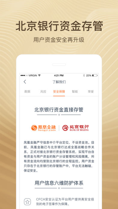 新人专享12%收益产品,卓越金融机构及大型企业提供保障。420多万用户的选择,交易额突破500亿元,平台所有投资迄今均如约兑付。凤凰卫视集团旗下智能金融服务平台,中信集团、中科院等国资金融背景股东投资,中国互联网金融协会首批会员。 【新手特惠】新人注册即送1888元红包,投资新手标享12%高收益,邀请好友投资可获0.3%返现。 【安全保障】国内最大城商行北京银行直接存管,国资金融股东投资,产品信息公开透明,银行级安全防护架构,CFCA安全认证。 【推荐产品】定期产品:约7.5%年化收益,持牌类金融机构和大型企业提供保障,历史兑付率100%。 【安鑫系列】精选个人信贷资产,100元起投,轻松灵活,年化收益高达9.3%。 【海外固收】年化收益最高达8%,享美元升值红利。 【联系我们】官方客服:400-076-1166;官方微信:fenghuangjinrong