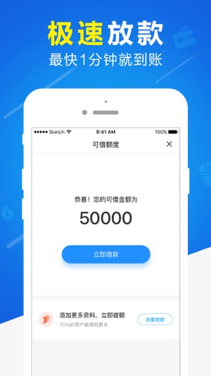 手机能上网就能借款,最快10分钟到账,无抵押无担保信用贷款。 【功能亮点】 1. 门槛低:极速模式,0门槛; 2. 放款快:贷款最快1分钟到账; 3. 材料少:无需资产证明、收入证明; 4. 免费申请贷款,不成功不收费; 5. 还款方便:手机还款,更便捷; 【关于快贷】 快贷平台于2015年2月发布,旨在为更多的互联网用户提供便捷、高效的互联网借贷服务。目前包含极速借款和大额借款两种模式,让用户在无抵押、无担保的情况下快速得到资金支持。 【联系方式】 客服电话:400-757-1310 客服微信号:快贷 地址:杭州市西湖区古翠路80号浙江科技产业大厦12楼 【说明】 快贷产品内所有…