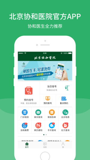 北京协和医院唯一官方手机APP,协和医生全力推荐! 北京协和医院官方APP提供预约挂号、当日挂号、无卡预约、门诊报到、候诊查询、自助缴费、取报告单、体检预约等强大服务,让患者可以直接通过手机预约挂号,免去排队困扰,享受更全面、更优质、更高效的医疗服务。 北京协和医院官方APP是医院和杭州恒生芸泰网络科技有限公司联合推出。 特色功能 预约挂号:协和医生全预约 当日挂号:当日号一手掌握 无卡预约:初诊患者不奔波 候诊查询:候诊情况实时查 自助缴费:手机缴费不排队 取报告单:化验结果早知道 体检预约:多种组合任您选 --我们一直在提高用户体验的路上探索,您们的支持就是我们的动力,感谢您们的支持!