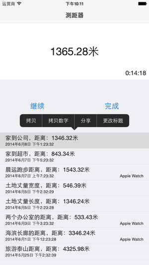 您想知道您和朋友之间的距离吗?您想知道您的小区有多大吗?您想知道每天晨练走多远吗?您想知道。。。 这是一款方便实用的“距离测量”应用。通过步行的方式来测量两地的距离,记录测量数据,测量数据还可以通过短信等多种方式分享。本应用主要特点是: 1、配套Apple的协处理器一起工作,采用最新的算法,大幅提升了测量精度; 2、测量时不用一直开着应用,手机可以休眠、接听电话和运行其他应用等; 3、可以中途暂停测量,方便中场距离的测量; 4、可通过短信、微博等多种方式分享测量结果; 5、可配套Apple Watch版本使用,iPhone可以同时管理本机和Watch的数据。 赶快下载,看一下您们之间的距离…