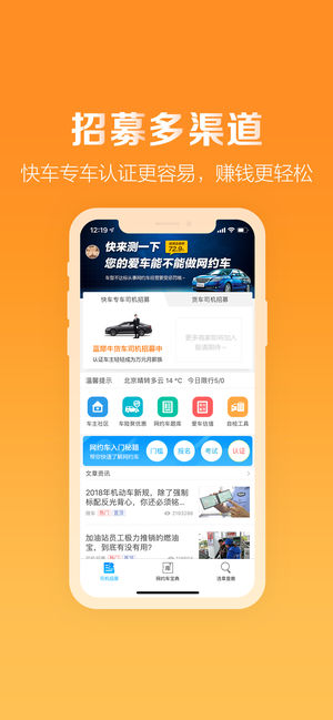 司机招募——网约车生活,等你入伙! #励志做东南亚首屈一指的司机解闷儿&唠嗑儿平台# [多渠道招募]司机招募平台多选,申请自由选择,认证快车更容易 [老司机社区]专供老司机交流,加入自己专属圈子,找到志同道合的老司机谈天说地 [网约车宝典]顺应网约车新政,实时更新独家考试真题,考试通过率高,快速拿证 [全方位练习]练习模式考点解析,真实还原模拟考试,错题难题一键收藏,考试难点逐个击破 [网约车秘籍]专职老司机实战经验总结,资深专家解答直击新政 [大数据统计]尾号限行,违章实时查询精准可靠,违章路段数据大统计,摆脱贴条烦恼 我们的服务对象是千万网约车车主、司机从业者,是帮助您顺利…