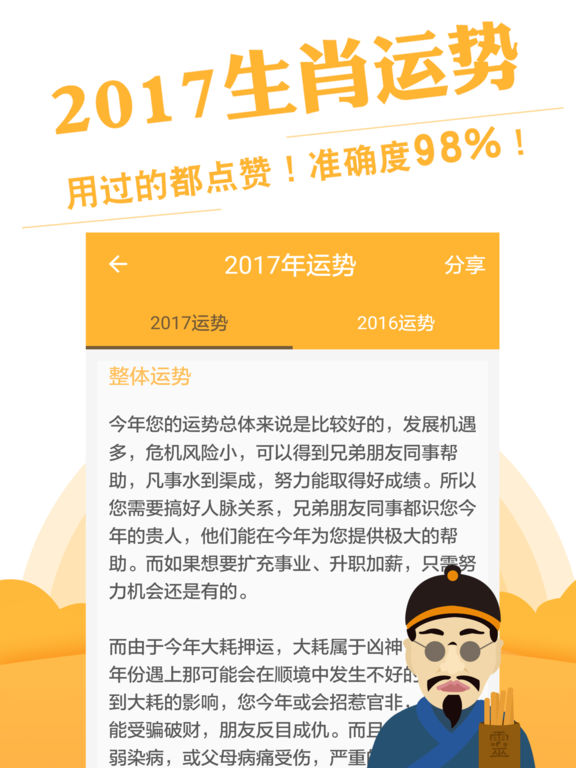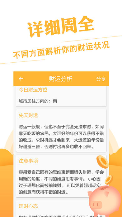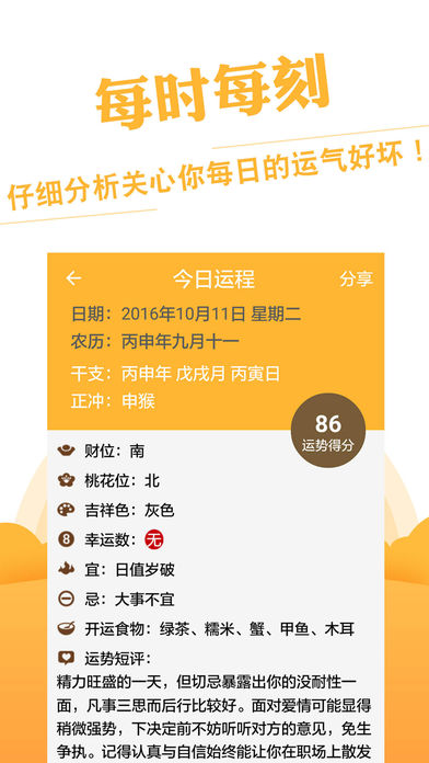 集性格分析、生辰八字、命理占卜、生肖配对、八卦易经于一体的综合预测第一平台。 ⊙全球算命排名第一应用 ⊙全球最多人使用的八字排盘工具 ⊙传统子平八字和现代社会文化结合,打造最适合当代的新八字论命 ⊙集多位算命大师智慧成果, 30年真人论命经营,百万真人命理共同验证 ⊙铁断感情婚姻,工作事业,财富投资 子平八字源自唐朝时期,是公认流传最广的算命方式,从人的出生信息中就能预见一生的际遇变化,助人掌控命运。本应用由真实八字大师,结合当今社会文化,推出一套最适合当代使用的八字论命学。 应用个别内容揭秘: 性格分析 揭秘人性最真实一面,假君子、小人立刻显性,人心险恶提前预见,全新认识您的朋友圈子。 婚恋建议 铁断一生感情生活和婚姻情况,告知什么时候能够谈恋爱以及结婚年份。 事业财运 找出最适合您的工作和理财方式,股票投资也能收放自如,避免悲剧发生。 运势分析 每年、每月、每日的运势都能预测,是您最需要的运势小管家,密切关注您的运势起伏。 想要了解命运又或者觉得生活并不是100%满意可以下载应用。 不是每一个人都能找到改善人生的机会,也许不能让您成为一个亿万富翁,但能令您生活更为顺利。 八字每月运程分析: 内容:本月运程 时间:一个月 价格:¥18 /月 订购每月运程分析可以通过iTunes账户的信用卡直接付费。付款后将会收到iTunes账户确认购买。 如果当前订购周期(一个月)结束前24小时内未取消续订,我们将会自动为您续订下一周期的每月运程分析。在订购有效期内,无法取消。订购成功后,可在“ 账户设置“中管理自己的订购服务。 详情请见隐私政策网址:http://www.linghit.com/protocol.html