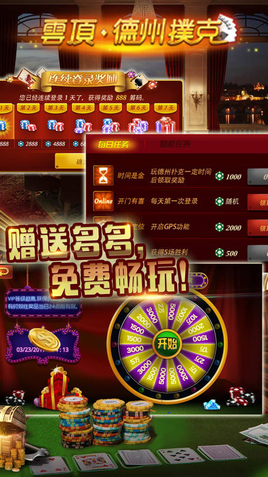 德州扑克,全球最流行的扑克游戏。好玩、刺激、比智慧、拼勇气。规则简单,轻松上手,却又极富策略性,变化无穷。全球已有WPT、APT、WSOP、APPT等多项职业赛事。加入云顶德州扑克,下一个赌神就是你哦! 游戏特色 * 开心语音,边玩边聊。玩牌、交友双丰收! * 筹码各种送,登陆、时长、牌局、分享…领到你手软! * 互动表情,妙趣横生。好友来了,迎接他的有香槟;若是那坏蛋来了,迎接他的有机枪! * 多种多样的道具,彰显您的个性,助您在牌桌上无往不利。 * 极低的手机流量,丰富的登陆通道,无需注册,登陆即玩! 客服支持 * 邮箱:service@ksn-tech.com