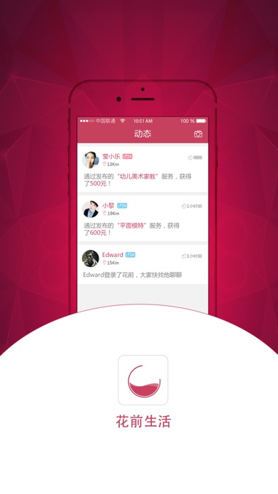 内容摘要 【国内第一款专注于专人专业专心服务用户私生活的手机软件】 【2015年最轻松的赚钱方式】 ........................................................ 无论你需要的是专业级台球指导老师、私人健身教练、专属私人导游,或者是电影鉴赏、心灵疏导、吃饭K歌。在花前,你都可以找到贴心专业的私人服务;同时,不论你是大师级专业人才、还是业余玩家或者只是单纯喜欢某一活动,都可以通过花前将它变成一项私人服务,在零散的业余时间将技能和兴趣转化成薪酬。 当一个人拥有了私人服务,那这种生活选择必然促成这个人独特的生活方式和态度。之前,自己涂脂抹粉,自己下厨造饭,自己爬山锻炼……现在,花前可以让你拥有别人送上的专业化的私人服务,解放你的手脚。在这里,你可以成功地将自己从人群中划分出来,满足您精神需求,独特的格调。拥有独特的话语权和身份象征。 花前,一个发布和寻找私人服务的专业平台,一个随时随地定制、管理私人服务的贴心管家。 特色功能: 1、随时随地召唤附近私人服务 一对一个性化私人专属 2、发布服务,自由快乐把钱赚 2015最轻松、赚钱的兼职机会 3、拒绝“low”,不做“looser” 学习、提升技能,女神、男神、大拿随叫随到 4、终结你的孤单 花前月下,女神男神,让生活充满情调 使用场景: 1、需要某一项专业服务的你,通过花前可以寻找可信度高、性价比优的私人导游、教练,美容师等; 2、想利用业余时间学习或提升某一方面的技能的你,可以用花前找人学习和提升英语口语、骑马、游泳等各项技能; 3、闲暇时间不知干什么,一个人又太无聊,用花前找人打发时间(闲聊,网游、看演唱会等); 4、送礼新潮流,给女朋友送一个美容顾问,给上了年纪的客户送一个私人保健师,给事业有成的老朋友送一个私人秘书,张扬属于你自己的格调。 6、依然单身的你,通过花前.私人服务,邂逅、约会你的TA。 7、如果你有技能、有闲暇时间、想赚钱,通过花前发布你所提供私人服务,赚钱交友两不误。