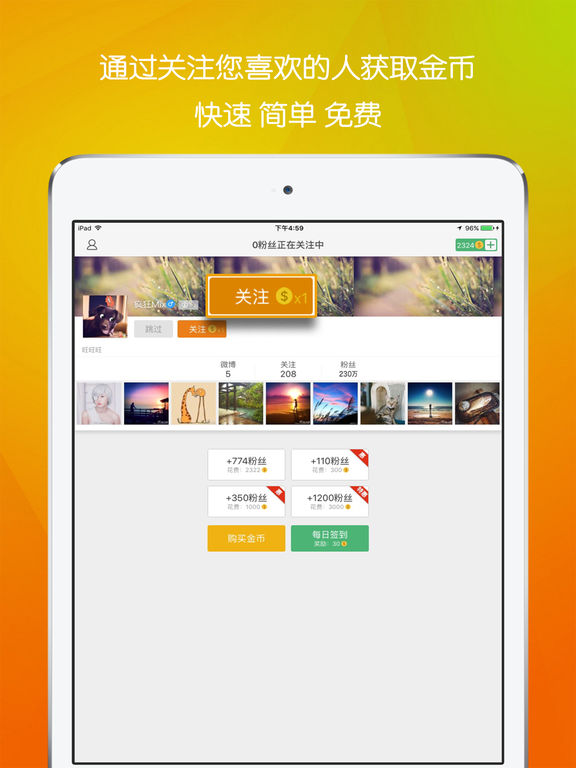互粉大厅免费让您快速地获取大量活跃,真实的新浪微博粉丝!如果您想获得大量粉丝,我们将您的信息推送给成千上万的用户并关注您。 互粉大厅,轻松帮您加粉丝!微博活跃度低,不好玩?求转发!求粉丝!您是否粉丝太少,没有激情?没人转发,没有动力?来这关注有趣的人,结识好友,提高互动,提高微博知名度! 如何获取粉丝? 步骤1:关注您喜欢的用户获得金币,或者购买金币 步骤2:购买您想要获取的粉丝数量(买多赠多哦~) 步骤3:静静的等待您的粉丝到您的碗里