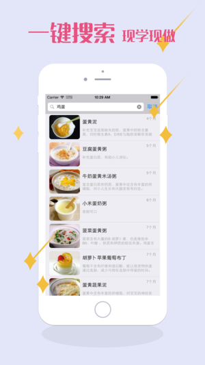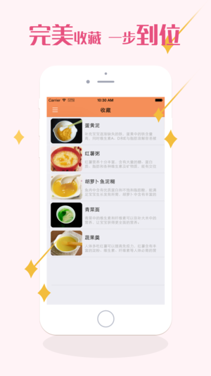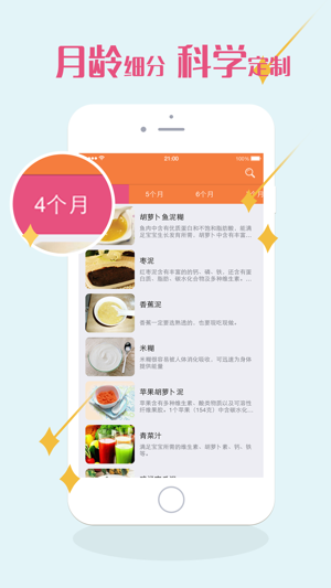 孩子不好好吃饭、挑食怎么办?给孩子准备的食物缺乏创意,孩子兴趣索然怎么办?儿童食谱的营养如何搭配才算全面?如何让宝宝吃得结实、健康、营养均衡?......相信这是很多新手爸妈头疼的事,别担心,宝宝辅食菜谱来帮您! 【宝宝辅食菜谱】是真正意义上纯粹为0-6岁宝宝定制,全面均衡宝宝每日所需营养,让父母省心,让宝宝健康成长的食谱。 国际卫生组织和国际母乳协会建议宝宝4个月以后添加辅食。从四个月开始,光吃母乳或者婴幼儿配方奶粉已经无法满足宝宝多样化的营养需求,就必须添加辅助食品,如蛋黄、米糊、菜泥、水果泥、鱼泥等,这也是断奶、吃固体食物必须的过渡阶段;宝宝进入了学习咀嚼及味觉发育的敏感期,对食物表…