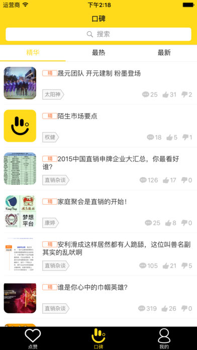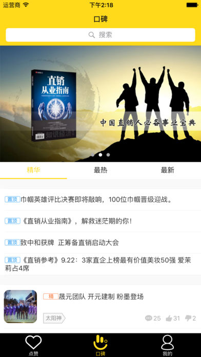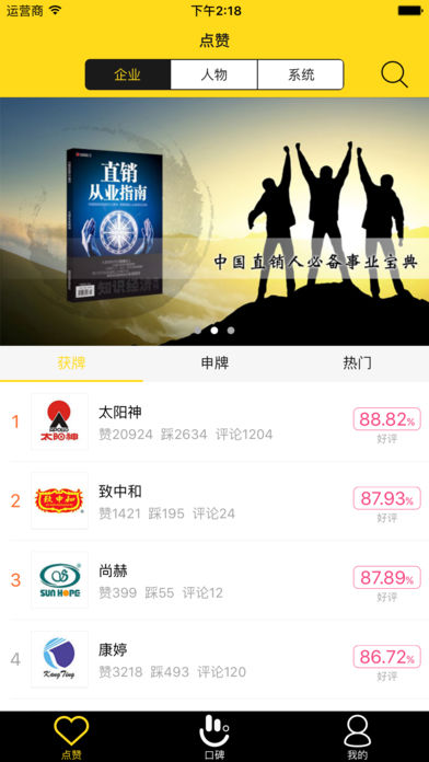 直销口碑是一款反馈直销从业者真实评价的手机应用,也是一款做直销企业、系统、人物口碑排行的手机应用。主要功能有: 1、用户通过赞、踩、罩对企业、系统、人物进行客观评价,app再根据赞、踩、罩数量计算出好评率,并根据好评率高低形成口碑榜单; 2、app收录了活跃在市面上的95%以上的直销/准直销企业、系统、高管及经销商信息,用户可搜索查看企业是否获牌,了解系统及经销商信息; 3、用户可对企业、高管进行客观评价,为直销新人提供意见参考; 4、用户可发帖讨论热点话题、经验教训、百科知识; 5、用户可将喜欢的企业、系统、人物、帖子分享至微信好友、微信朋友圈、QQ好友、QQ空间等社交平台,扩大其影响力。