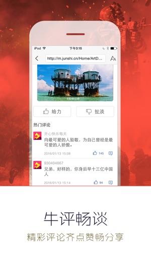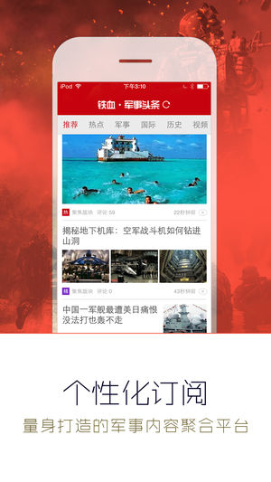 看军事,就得上军事头条 智能推荐:BAYMAX个性化订阅引擎为你量身打造的军事内容聚合平台。 实时资讯:随时随地发现新内容,为你带来全方位的军事新闻,军情动态。 深度专业:专家实时解读,军事内容更专业,全球军情动态一手掌握。 话题社区:最大的军事爱好者社区,资深军迷的聚集地。 一键分享:军事新闻一键分享到微博、微信、qq空间等社交平台。 千万军迷朋友的兴趣所在之处,铁血网荣誉出品。 如果遇到闪退问题,或者对产品有想法或建议,期待您及时反馈给我们: 客服QQ:2384096998 QQ群1:285484278 QQ群2:579185009