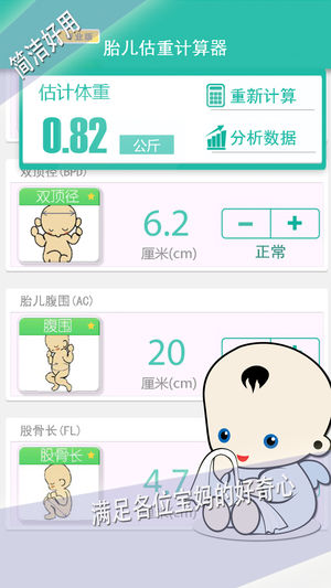 此应用经由执业医师自主开发,产科医师产检必用的一款胎儿估重计算器,当然,有了这款应用,准妈妈完全可以根据产检BC单上相关数据(双顶径、腹围、股骨长)计算出胎儿体重,很大程度上满足了各位宝妈的好奇心,您值得拥有。 特色功能: 输入孕周及B超检查结果上的参数,就可以自己算出体内胎儿的重量和发育情况,再也不用麻烦医生:-)