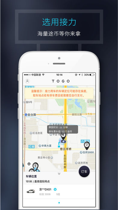 TOGO是基于移动互联网的汽车共享出行平台,为用户提供城市内的即时,短程出行服务。TOGO按分钟计费、自助租车、随地还车的运营模式,为用户带来犹如私家车一般的高品质出行体验,可满足出行、购物、聚会等各种出行需求。现阶段,TOGO通过使用更节能、环保、智能车型,希望可以有效降低机动车给城市带来的城市污染和交通压力。 TOGO用户通过LBS技术定位预定距离您最近的车辆,可即时或提前15分钟预定,全程手机控制车辆(包含车门开关,闪灯寻车等功能),自助开启自由旅程,到达目的地后,将TOGO共享车停放在任意一个合法停车位、通过App完成费用支付即可。用户仅需为单次车辆出行使用支付费用。TOGO标准化的线下运营体系包揽了驾车以外的所有事宜,为用户出行提供安全、标准、便捷的服务体验。