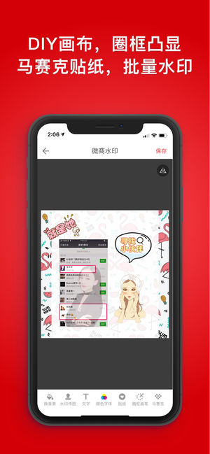 微商水印相机是针对微商打造朋友圈营销,作图做视频和素材下发的一站式工具。目前用户规模超过3000万,是微商代理必备的工具APP。 主要功能特色: 1.批量水印:可以一次选择最多100张图片,批量添加水印。支持在线模板,相册上传水印。支持添加文字水印、标签、贴纸、马赛克、圈框画笔、突显效果、滤镜、剪裁,以及对上传的照片进行自由裁切和抠图、正片叠底、加阴影等处理! 2.海报大片:不用花钱找设计师,分分钟设计出自己的海报,只需修改图片和文字,海报主题针对微商经营场景设计,支持添加图片抠图、翻转照片、支持上传视频、添加视频声音等; 3.DIY画布:这个功能其实跟批量水印类似,区别是可以自由创建各种比例…