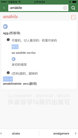 外研社畅销词典,意大利语学习者好帮手。《外研社现代意汉汉意词典》于2000年11月初版发行,手机版与2012年7月第12次印刷版同步,是意大利语单词查询的便捷工具,也是意大利语阅读、意大利语写作、翻译查询的得力助手,词典共收意汉汉意词四万余条,除基本词汇外,还收录了近年来社会政治、经济、外贸、法律、科学、技术、文化生活等各方面的新词汇和术语。 海笛携手外研社正版发布,具有通知栏快捷查词等便捷查词功能,还有意大利语/汉语词条均可真人发音、意大利语例句发音、生词收藏和复习等辅助学习功能。选择正版词典,学习更有保障!(版权所有,盗版必究) 词典特色: (1)官方正版:它是由外语教学与研究出版社出…