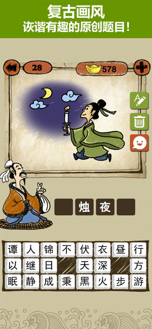 1300个成语关卡,打造史上最强的猜成语游戏!复古画风,诙谐有趣的原创题目,连马伯庸等文化名人都爱玩它^o^ 寓教于乐,独一无二的中文猜谜游戏~ 独树一帜的画风,诙谐有趣的题目,用一幅画或几个字来猜一个成语,巧妙的图与字的结合,让你苦思冥想后恍然大悟,开怀一笑!寓教于乐,绝对是老少皆宜的文字游戏佳品! 每关都有成语解释和汉语拼音,千钧一发的『发』是读fà还是fā?什么?!一五一十的『五』是读wú第二声,不是wǔ第三声啊>__< • 每日推送新关卡,天天新题猜不停! • 收『藏』功能,学而时习之不亦说乎^0^ • 支持微信登录,游戏进…