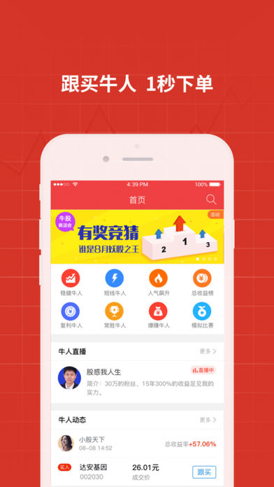 2015年十大炒股App!跟炒股牛人学选股、看牛人直播实时解盘、观察牛人操盘记录。 ——千万用户选我们的原因—— 【牛人直播解盘】在线权威解盘,实战牛人秒回,千万用户实力验证; 【实盘炒股大赛】 数万奖金等你来分; 【超低交易佣金】万2.5超低佣金,股票实盘开户,随时随地在线交易; 【牛人持仓记录】实时推送炒股牛人交易信息,一键跟买,牛人赚我也赚; 【即时股票行情】直连交易所行情数据,买卖时机快人一步; 【炒股达人互动】牛人社区互动秒回复,跟牛人过招! 【模拟炒股练手】注册即送100万模拟金练习炒股; ——典型用户的使用评价—— 身边朋友都在用,新上的股市直播功能也很好,有老师实时在线帮着解答问题,以后炒股就用它了,哈哈!——隔壁老王姓张 小白股民的炒股神器!有智能盯盘功能,大神买卖了股票马上就知道了,从此不用再为选股和买卖的时机头疼了!以后炒股就用它了!——追你跑丢鞋哦 炒股大赛很有挑战性,刺激好玩,上榜还能换手机充值卡,是学习投资的好平台。——我的电视直播软件 联系我们 QQ群:273050548 电话:4000602897 微信号:gongniu600 邮箱:kf@gongniugu.com