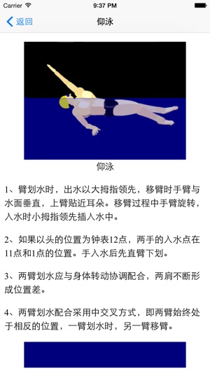 游泳教程离线保存了蛙泳,仰泳,蝶泳,自由泳的3D动画文字说明,还有高清教学视频。 每套教学视频时长均达50分钟,详细介绍了动作拆解、错误动作示范、注意事项、儿童标准动作示范、成人标准动作示范,只要用心看,好好练,一定能快速学会游泳。
