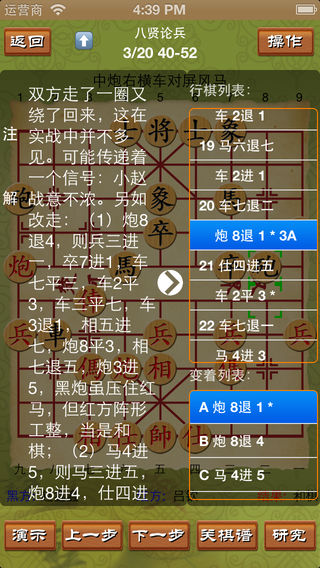 ◎象棋藏经阁是最好的支持注解与变着的中国象棋动态棋谱软件。 ◎收录了近几千部经典的棋谱,数以万计的变着和精彩解说,深入分析学习。 ◎可以手动或自动的动画演示每一部棋谱,而且还能从某一状态研究该棋局。 ◎将某一棋局状态导入象棋2012软件中进行对战或导入象棋打谱王中推敲研究。 内容分类: ◎1.棋书巨著:《象棋兵法-吴贵临著》《弈林新编-杨官璘著》《象棋指要-谢侠逊著》《马炮争雄-黄少龙著》《中国象棋高级教程》《象棋怪招速胜法》《象棋陷阱速胜法》; ◎2.大师棋路: 《银川棋路》《吕钦棋路》《洪智棋路》《赵国荣棋路》《赵鑫鑫棋路》《胡荣华妙局精萃》; ◎3实战精选: 《八贤论兵》《象棋实战短局精彩杀势》《象棋快杀速胜》《象棋国手绝胜妙局》《2008全国象棋个人锦标赛特辑》《2009全国象棋个人锦标赛特辑》; ◎同时支持ios所有设备,在iPad,new iPad上效果更佳,一次购买,全系列设备都可以安装,如iPhone,iTouch,iPad. ◎◎ ◎为支持iphone5特别优化界面,完美支持iphone5,无黑边.◎◎ ◎支持 中文,繁体中文,以及英文。并有二种棋子表示。传统的中国棋子与类似国棋象棋的棋子。可以在设置里设置。◎