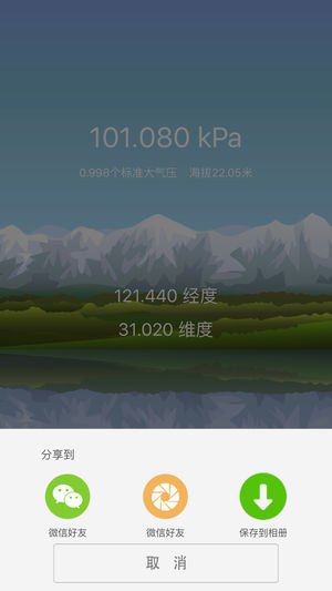 气压计使用了手机里面自带的气压传感器进行测量气压。它是目前最准确的气压测量工具。 功能: 1. 最精确的气压测量工具。 2. 支持查询GPS经纬度。 3. 提供了六套精美的背景。 4. 支持分享动态到朋友圈和微信好友。