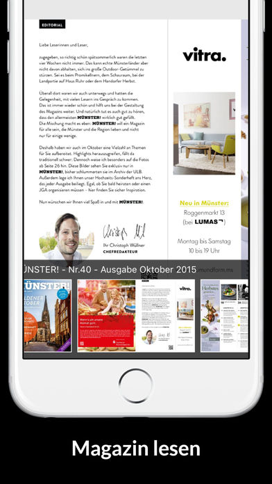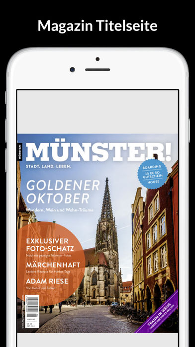 MÜNSTER! ist das Lebensgefühl-Magazin für Münster und das Münsterland. Einmal im Monat aktuell, voll gepackt mit Tipps & Terminen, tollen Reportagen und Fotos, leckeren Rezepten, großartigen Wohn-Reportagen, packenden historischen Stoffen, Hintergrundberichten zum SC Preußen Münster, interessanten Porträts und Interviews und, und, und - aber immer aus der Region für die Region! Hier gibt`s das ganze pralle Leben im Münsterland in hochglänzender westfälischer Bodenständigkeit. MÜNSTER! - Das Magazin für alle, die Münster und das Münsterland lieben! Die Preise staffeln sich wie folgt: Einzelausgabe: 3,99 € 3 Monats Abo: 5,99 € 6 Monats Abo: 11,99 € 12 Monats Abo: 23,99 € Mit einem Abonnement erhalten Sie Zugriff zu den Magazinen für die jeweilige Laufzeit. Die Abonnements erneuern sich nach Ablauf automatisch. Wenn Sie das Abonnement kündigen möchten, können Sie dies 24 Stunden vor Ablauf tun.