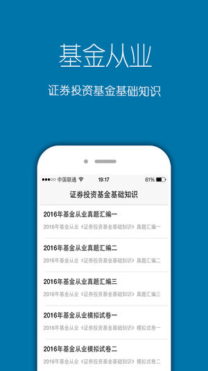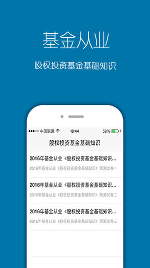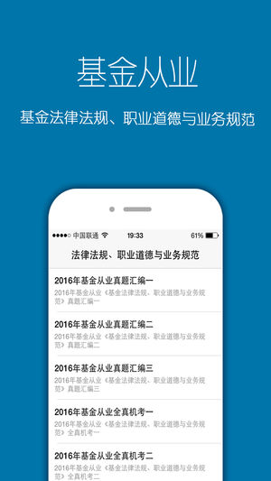 《基金从业资格考试》 应用介绍: 针对基金从业资格考试所制定的专业辅导软件,为从业考试学员提供证券投资基金,基金法律法规的题库。 真题解析——历年真题解析,押题好伴侣 离线使用--无广告,无需网络,方便便捷。 股权投资基金基础知识 2016年基金从业《股权投资基金基础知识》预测试卷一 2016年基金从业《股权投资基金基础知识》预测试卷二 2016年基金从业《股权投资基金基础知识》预测试卷三 法律法规 2016年基金从业《基金法律法规、职业道德与业务规范》真题汇编一 2016年基金从业《基金法律法规、职业道德与业务规范》真题汇编二 2016年基金从业《基金法律法规、职业道德与业务规…