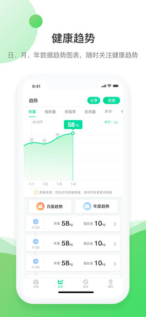 bodivis(好体知),清华大学团队领衔,历时十年基础研发拥有自己的中国人体成分数据模型和核心算法,详细多种体成分数据展示:N1(脂肪肝风险度),体重,体脂率,肌肉,骨骼肌,骨质,内脏脂肪指数等,专属运动饮食建议,让你更加了解自己。 功能介绍: 【实时评测】详细分析身体成分,健康数据实时掌控 【运动饮食】运动饮食科学管理,让您瘦身有依据 【健康趋势】坚持每天评测,健康趋势一目了然 【数据对比】数据对比展示,时刻关注您的点滴变化 【阅读推荐】健康减脂,营养饮食等专业知识助您了解健康 【成员管理】监测管理您身边每个家人的身体健康状况 【目标设定】科学规划减肥目标,为您的健康负责 【配合硬件使用…