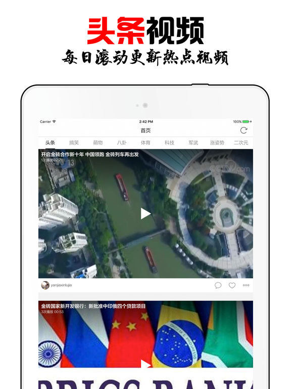 视频大全,你关注的头条视频新闻平台。 每日为您实时动态更新全球热点视频新闻,让你足不出户知尽天下事。 [应用板块] 头条视频,每日精选热点视频新闻 搞笑逗趣,精选全球爆笑精彩瞬间 萌物集锦,看可爱致萌动物呆萌秀 八卦爆料,娱乐圈火辣八卦尽收眼底 体坛快报,最新体育赛事战绩快报 科技前沿,炫酷黑科技让你大开眼界 军武热点,全球先进武器装备大盘点 涨姿势,大千世界无奇不有 二次元,与萌新二次元零距离接触 [内容驱动] 主要有:优酷视频、土豆视频、腾讯视频、网易视频等 转载声明: 本应用部分内容来自互联网及用户投稿,若侵犯到原作者的著作权,请及时通过应用设置内的“意见反馈”功能或者邮件(service@hpyshark.com)与我们沟通,我们将主动清除侵权内容。