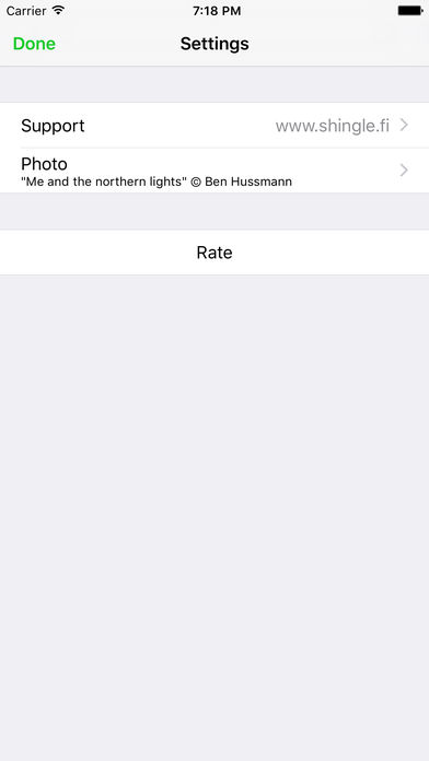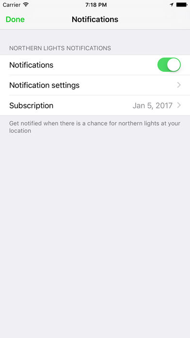 Northern Lights forecast easily! The app tells you probability to see Northern Lights based on your location. Works anywhere, anytime. • Alerts • Get notified when there is a chance to see Northern Lights near you. • Sharing • Share the probability with your Facebook or Instagram friends so they know about the opportunity also. • Apple Watch app • See the probability easily with your Apple Watch. Supports complications and glances too.
