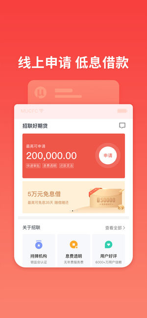 招联好期贷—信用贷款,秒速到账:仅凭身份证即可在线申请,1分钟放款,最高20万元额度,日利率低至0.029%。 【平台介绍】 招联消费金融旗下普惠贷款产品——好期贷 招联金融:由招商银行与中国联通共同组建,银监会消费金融持牌机构。为您提供银行级安全、专业、便捷的现金借贷、分期消费服务。 【产品优势】 申请易:全线上申请,无抵押,免担保,“刷脸”得额度,15秒出结果 速度快:极速放款,现金秒到账 额度高:高达20万,额度循环使用 利率低:借1万日息低至2.9元 【联系我们】 微信关注“招联金融”公众号,为您提供专业贷款服务! 官方微信:招联金融 官方网站:www.mucfc.com