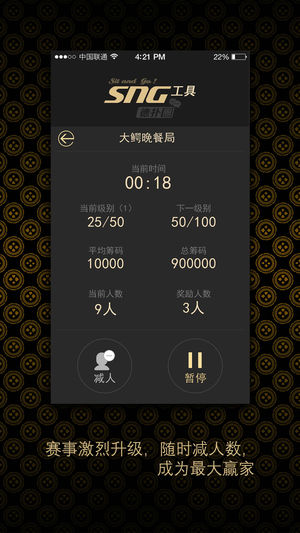 线下时玩时开,计时升盲,德扑圈sng工具帮你贴心搞定! 加减人数,随时随刻! 自由选择,快速激烈,一切由你决定! 人数,盲注,级别,筹码,满足你想要的设定! 快速喊人,立刻组局,专属于你的sng小工具。