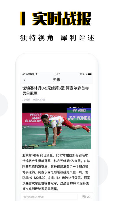 世预赛12强赛,国足VS乌兹别克,全方位实时直播! A8体育,比赛视频流畅直播,随时随地观看比赛。 NBA,英超,西甲,中超,亚冠,欧冠,德甲,意甲,法甲,斯诺克,网球,CBA,欧联杯,足协杯,中甲,台球,高尔夫,羽毛球,乒乓球,排球,NFL,ATP,荷甲,澳超,世预赛12强赛,世欧预,国王杯,足总杯,F1赛车,电竞,搏击,NCAA,CNBA,欧洲杯,美洲杯,奥运会,世界杯,综合体育,其他运动项目……各类体育赛事,A8体育免费视频直播! 全面及时的体育新闻资讯,电视体育频道在线播放,各大联赛赛程全覆盖。 全程比赛录像回放,精选比赛进球集锦,丰富多彩的视听享受。 球队数据一览无余,关注赛事订制闹铃提醒,不再错过热点赛事。 国内外篮球足球等各类体育赛事免费同步直播! NBA常规赛、季后赛、总决赛免费高清直播! 英超380场在内的五大联赛免费视频直播! 中超、中甲、国足世预赛直播也不错过! [直播] 视频秒加载,多路信号赛事同步直播,免费高清在线视频直播。 [资讯] 实时体育资讯和新闻头条,高质量的体育内容盛宴。 [战报] 拥有详尽和及时的球队比赛战报,及时获取比赛进程信息。 [赛程] 前后七日赛事赛程尽情查看,覆盖各大体育赛事。 [原创] 视频|图文|精彩的原创栏目,犀利赛事评述,深度战术分析。 [社区] 跟全球各地的中国球迷一起聊球。 [数据] 球员一手信息,赛事海量数据一应俱全。 [周边] 知名足球篮球联赛俱乐部球衣、球鞋及周边等装备商品。 [真人秀直播]足球宝贝、竞彩专家、现场球迷实时直播,勾搭送礼混脸熟。 ******************************************************* 我们致力完善“A8体育”,如果您有任何意见,问题或建议 , 您可以电邮到:a8sport@126.com 或者加入我们的QQ官方群:192031309 *******************************************************